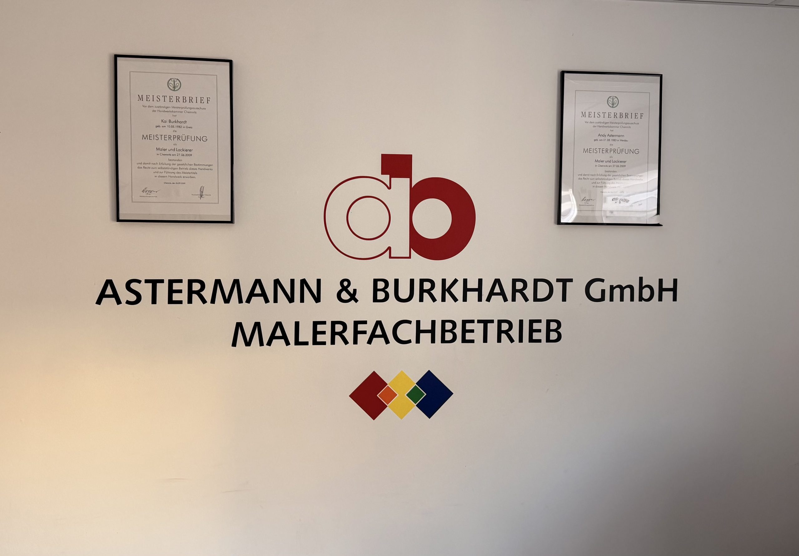 Das Unternehmen „Astermann & Burkhardt GmbH Malerfachbetrieb“ wurde am 04.01.2010 von den beiden Malermeistern Andy Astermann und Kai Burkhardt gegründet. Nach abgeschlossener Lehre des Malerhandwerkes und langjähriger Erfahrung als Gesellen, beschlossen Andy Astermann und Kai Burkhardt 2008 den Meisterbrief im Malerhandwerk zu erlangen und schlossen diesen im September 2009 mit Erfolg an der Handwerkskammer Chemnitz ab. Zu diesem Zeitpunkt war die Planung zur Firmengründung schon in vollem Gange.